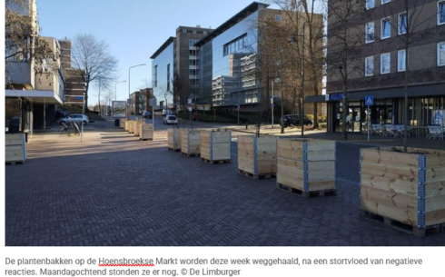 ○ In mijn geboorteplaats Hoensbroek dacht een wethouder om 2 weken voor de Verkiezingen – na bijna 4 jaar regeertijd en wachten – nog even eens iets extra’s te doen: plantenbakken , voor “vergroening” op het marktplein. Ze kwamen alle 60, in houten kratten. Omdat ik er ben opgegroeid, (her)ken ik de reactie van de inwoners: ” Afzender, retour “. En ‘verder geen ge……. ‘ Om zelf te lezen <klik hier>