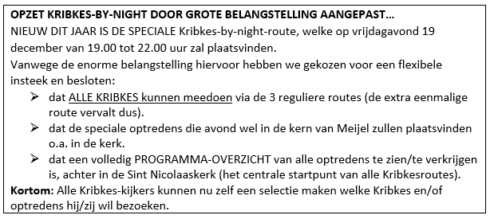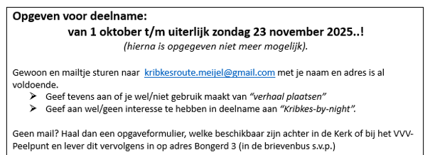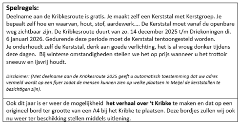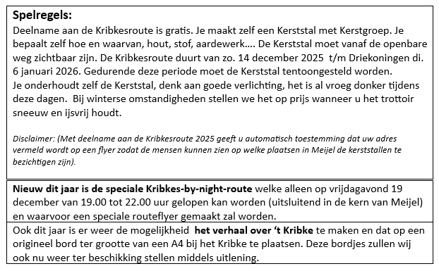 Ook dit jaar wordt er weer een Kribkesroute georganiseerd. Deze 5e Kribkesroute Meijel (1e lustrum) zal plaatsvinden van zondag 14 december 2025 t/m Driekoningen 6 januari 2026.